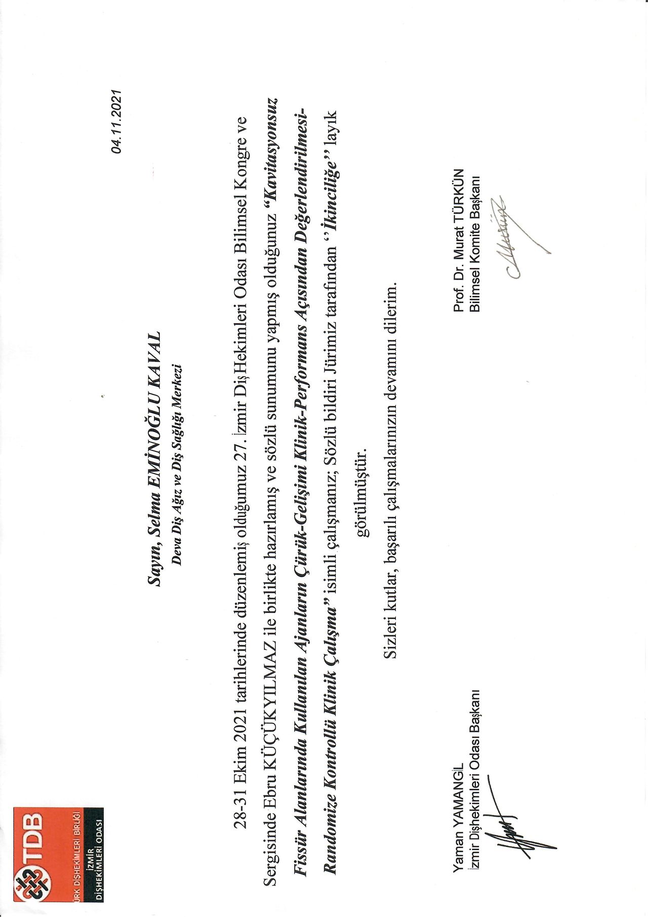 AKADEMİK ÖDÜLLER 27. İzmir Diş Hekimleri Odası Bilimsel Kongre ve Sergisi Sözlü Bildiri Jürisi Tarafından, ‘’Kavitasyonsuz Fissür Alanlarında Kullanılan Ajanların Çürük Gelişimi ve Klinik Performans Açısından Değerlendirilmesi-Randomize Kontrollü Klinik Çalışma’’ isimli çalışma ‘’En İyi 2. Çalışma’’ olarak seçilmiştir.